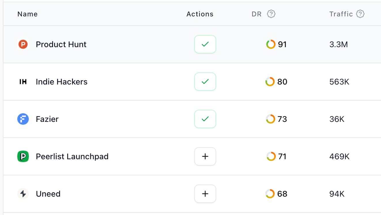 Browse our curated catalog of 400+ launch platforms with DR scores, traffic data, and pricing info to find the best fit for your product.